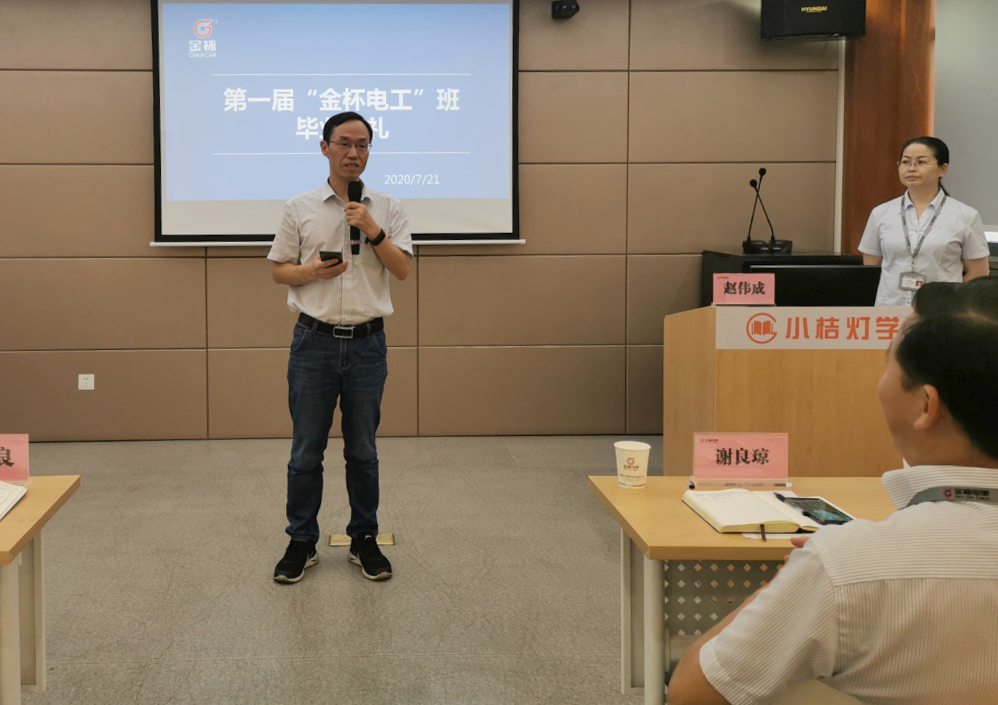 7月21日上午,首届“金杯电工”班毕业典礼在技术楼4楼隆重举行,该典礼由人力资源部部长赵伟成主持。公司总经理谢良琼、副总经理唐桂良、各车间主任、动力设备部负责人李康出席毕业典礼,43名金杯电工班学员参加毕业典礼。